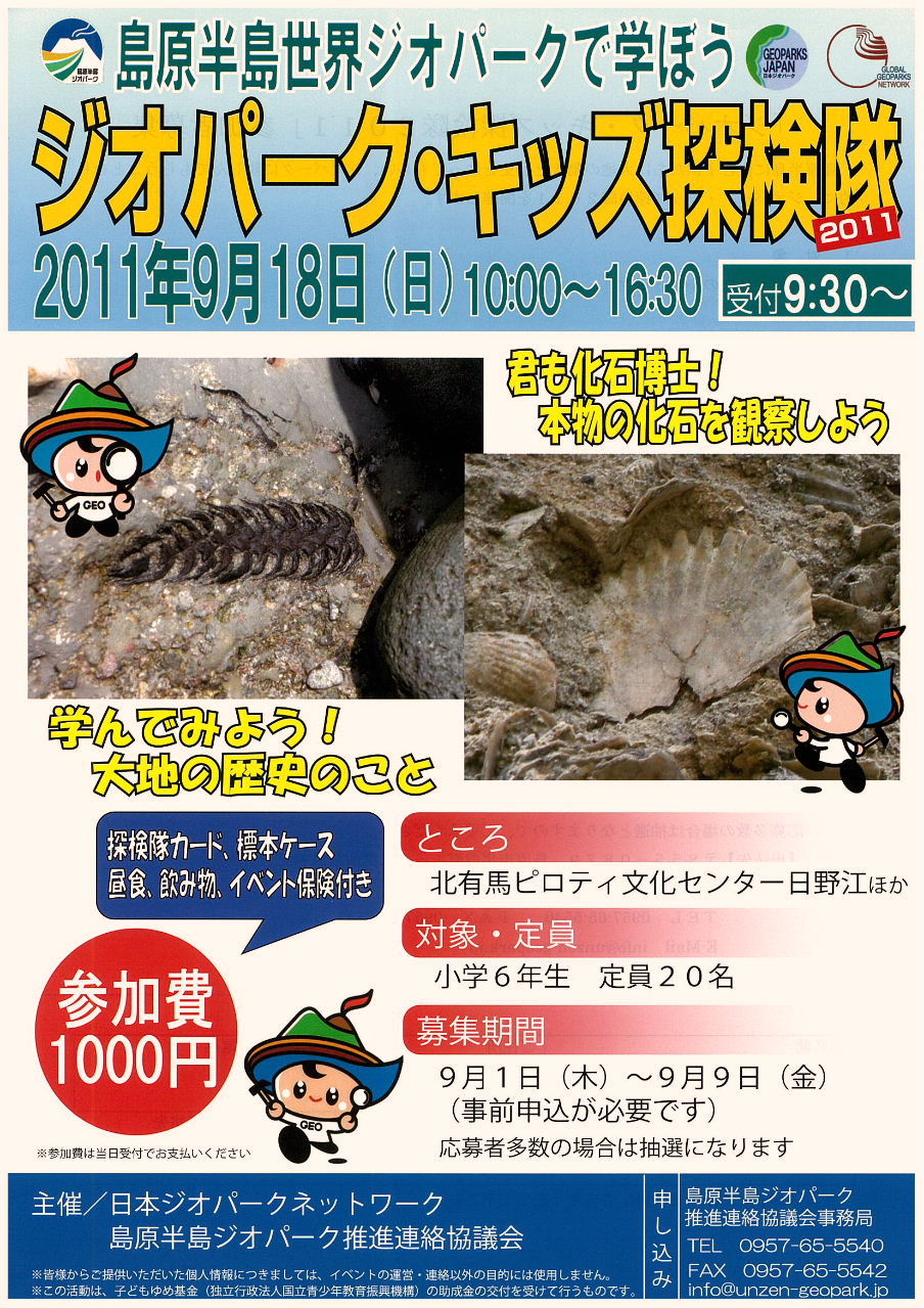島原半島に住む子供たちに大地の動きと歴史を知ってもらい、ジオパークに親しんでもらうことを目的に、ジオパーク・キッズ探検隊2011を開催します。