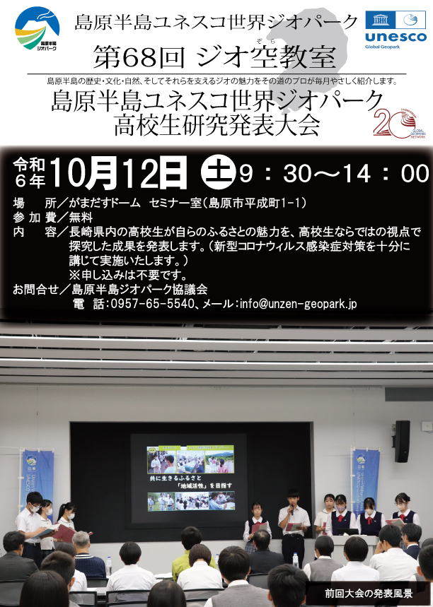 今回はその第68回として、高校生のグループが島原半島の自然や地球現象などを研究した成果を発表する「第13回 島原半島ユネスコ世界ジオパーク高校生研究発表大会」を開催します!