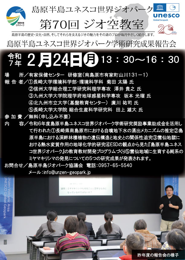 今回は、その第70回として、令和6年度島原半島ユネスコ世界ジオパーク学術研究奨励事業を